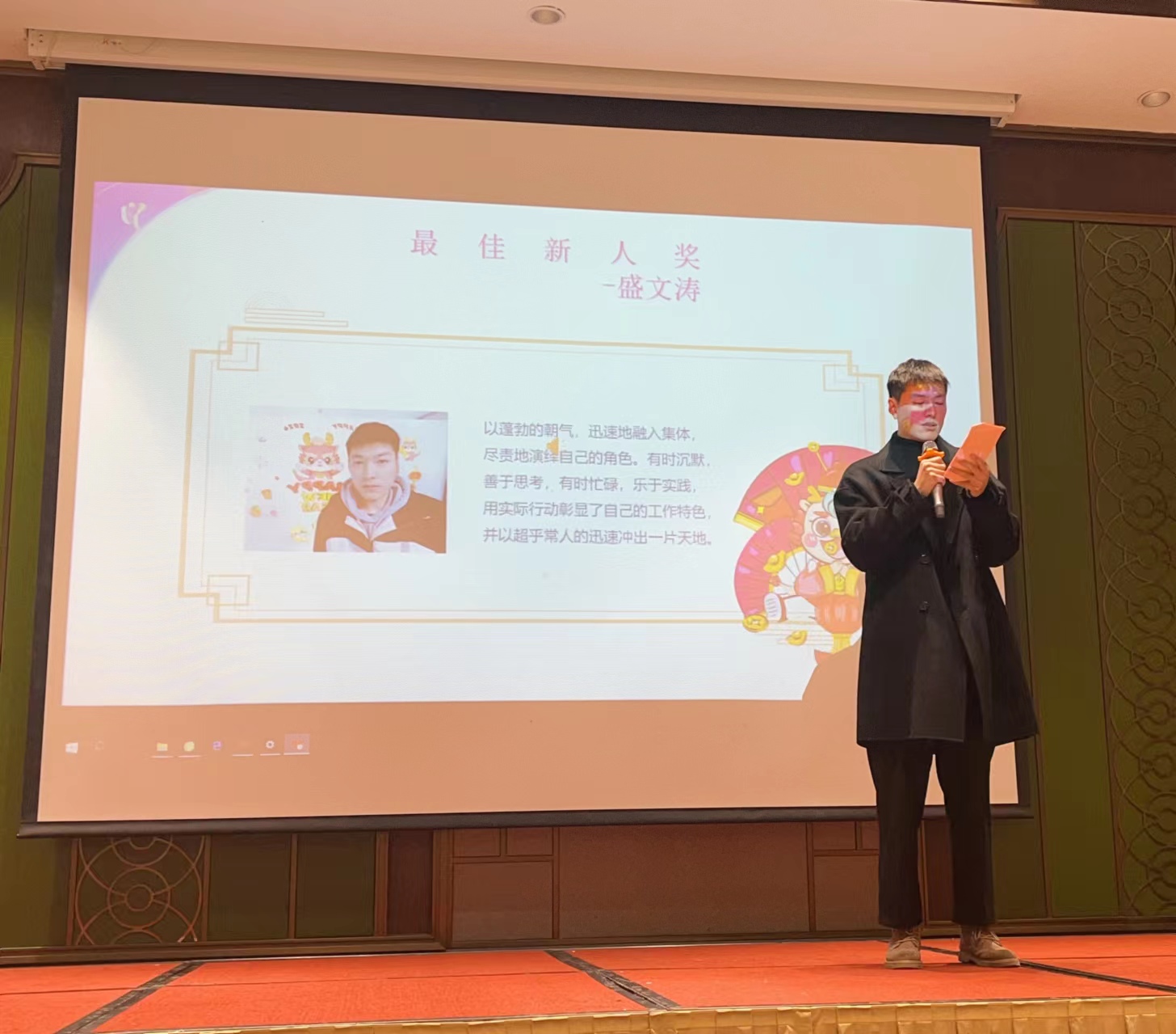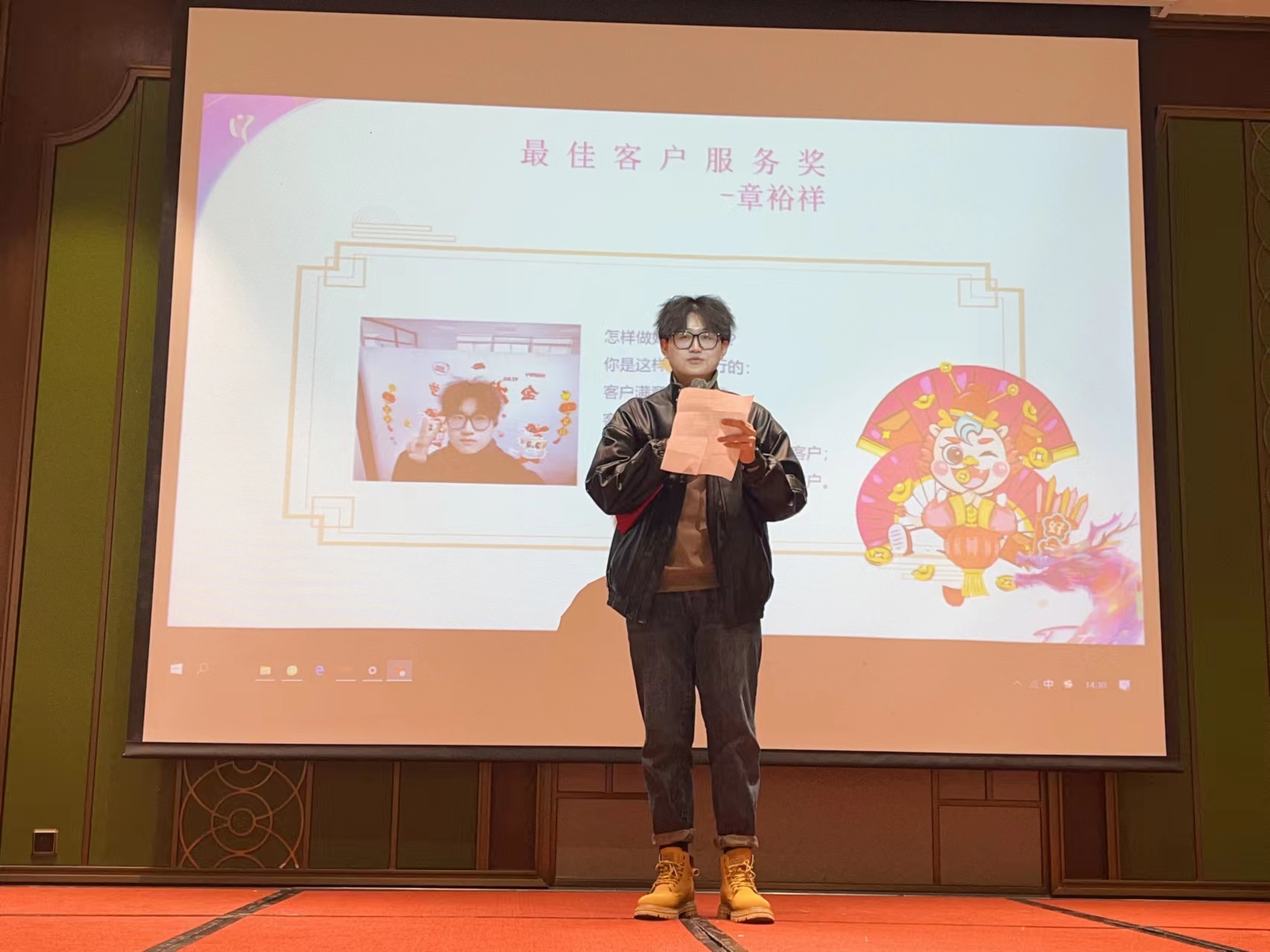 緊接著便是表彰與頒獎環(huán)節(jié),為了表彰過去一年中突出表現(xiàn)的優(yōu)秀員工,公司特別設(shè)置了三種獎項,“最佳新人獎”得主盛文濤:以蓬勃的朝氣迅速融入集體,盡責地設(shè)計好每個部件、畫好每張圖紙;“最美奮斗者獎”得主陳騰遠:以本職工作為先,以公司效益為本,兢兢業(yè)業(yè),積極進取,永遠有一股洶涌的干勁;“最佳客戶服務(wù)獎”得主章裕祥:用專業(yè)和周到的服務(wù)打動客戶,用真誠和耐心的素養(yǎng)滿足客戶,收獲的不僅是客戶的感謝信,更是努力付出的回報。公司給予三位優(yōu)秀工每人五千的現(xiàn)金獎勵,同樣也希望全體員工向他們學習,不斷進取、勇攀高峰,為公司做出貢獻。
