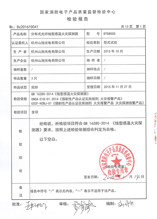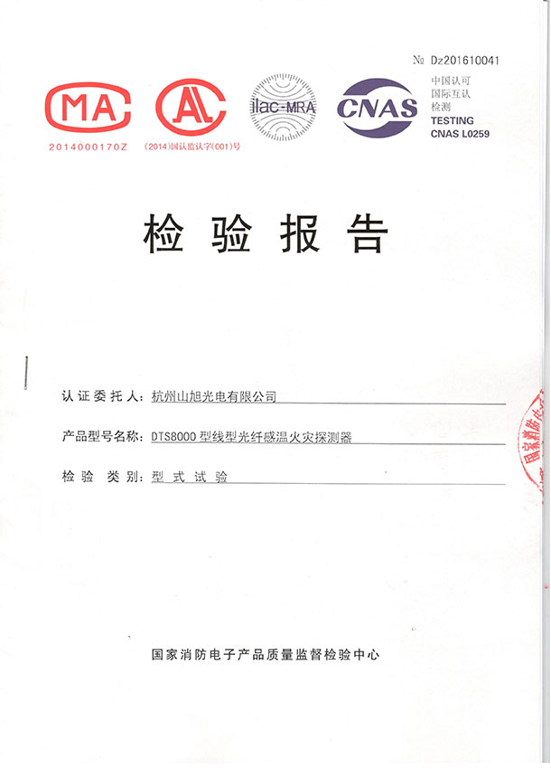 2016年01月14日,山旭光電DTS8000分布式光纖線型感溫火災探測器獲得獲得國家消防電子產(chǎn)品質(zhì)量檢驗中心頒發(fā)的型式檢驗報告,符合GB 16280-2014 《線型感溫火災探測器》要求。
