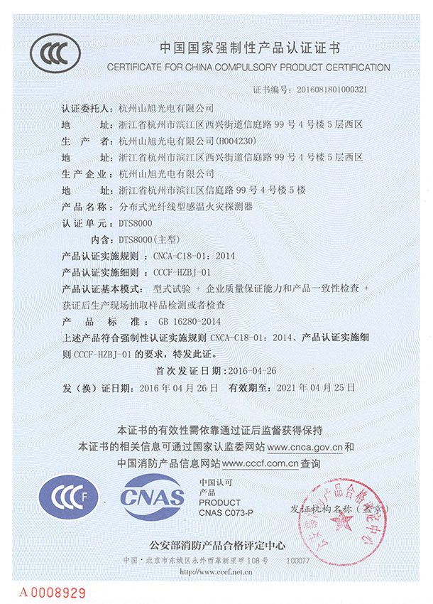 2016年04月26日,山旭光電DTS8000分布式光纖線型感溫火災探測器獲得了《中國國家強制性產(chǎn)品認證證書》,該證書由公安部消防產(chǎn)品合格評定中心頒發(fā)。