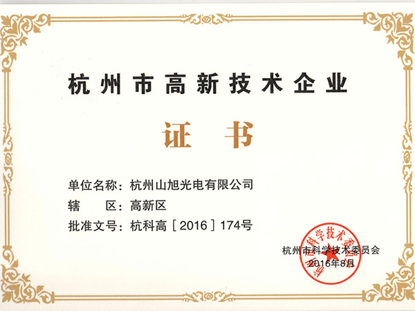 根據(jù)《杭州市高新技術企業(yè)認定工作的實施意見》,杭州市開展了2016年第一批杭州市級高新技術企業(yè)認定工作,杭州山旭光電有限公司(簡稱“山旭光電”)經(jīng)過嚴格的形式審查、苛刻的認證要求、復雜的指標和流程審核以及專家評審后,榮幸地入選2016年第一批市級高新技術企業(yè),并于2016年8月30日進行了公示。