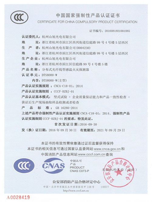 2016年09月30日,山旭光電DTS8000-W分布式光纖線型感溫火災(zāi)探測(cè)器獲得了《中國(guó)國(guó)家強(qiáng)制性產(chǎn)品認(rèn)證證書》,該證書由公安部消防產(chǎn)品合格評(píng)定中心頒發(fā)。
