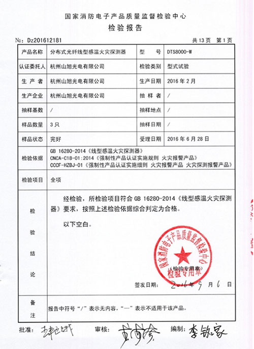 2016年09月06日,山旭光電DTS8000-W分布式光纖線型感溫火災(zāi)探測(cè)器獲得獲得國(guó)家消防電子產(chǎn)品質(zhì)量檢驗(yàn)中心頒發(fā)的型式檢驗(yàn)報(bào)告,符合GB 16280-2014 《線型感溫火災(zāi)探測(cè)器》要求。