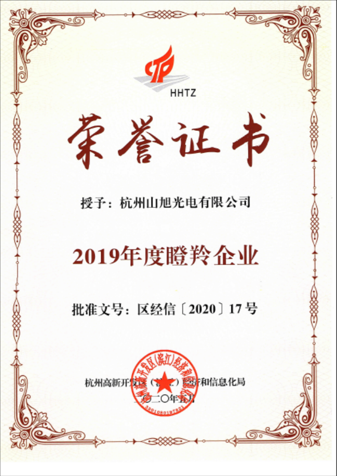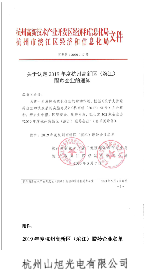 近日,杭州高新技術(shù)產(chǎn)業(yè)開發(fā)區(qū)經(jīng)濟(jì) 和信息化局聯(lián)合杭州市濱江區(qū)經(jīng)濟(jì)和信息化局共同發(fā)布了《關(guān)于認(rèn)定2019年度杭州高新區(qū)(濱江)瞪羚企業(yè)的通知》,杭州山旭光電有限公司憑借突出的創(chuàng)新技術(shù)和發(fā)展?jié)摿Γ脒x“2019年杭州高新區(qū)(濱江)瞪羚企業(yè)”。