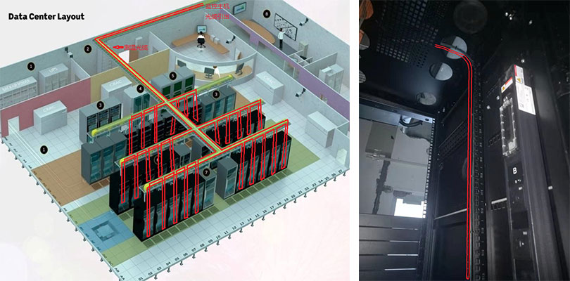 感溫探測光纜采用“幾”字形分別覆蓋敷設(shè)至機(jī)柜內(nèi)用于監(jiān)測機(jī)柜內(nèi)機(jī)架排實(shí)時(shí)溫度;使用扎帶將測溫光纜固定在機(jī)柜內(nèi);