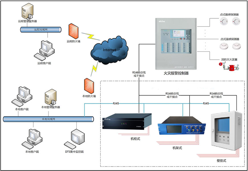 采用分布式光纖測溫系統(tǒng)監(jiān)測機(jī)房溫度,測溫主機(jī)可通過感溫光纜監(jiān)控設(shè)備溫度及室內(nèi)環(huán)境溫度,實(shí)現(xiàn)數(shù)據(jù)中心溫度實(shí)時(shí)測量,并實(shí)時(shí)進(jìn)行定溫、差溫報(bào)警判斷和光纖斷纖及系統(tǒng)故障判斷,溫度報(bào)警信息和故障報(bào)警信息可以通過界面板的LED指示,并發(fā)出相應(yīng)的報(bào)警聲音信號。通過數(shù)據(jù)接口與工控機(jī)及本地CRT相連,可以實(shí)時(shí)讀取測溫主機(jī)的溫度分布曲線和報(bào)警狀態(tài)信息,通過繼電器單元輸出至火災(zāi)報(bào)警控制器上。測溫主機(jī)通過以太網(wǎng)口可與中央監(jiān)控室的監(jiān)測系統(tǒng)相連,實(shí)時(shí)將現(xiàn)場溫度信息傳輸至中央監(jiān)控室。