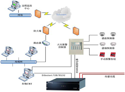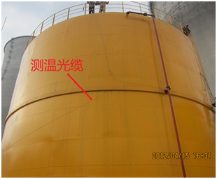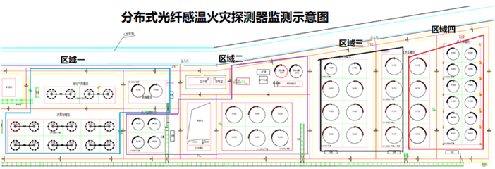本項(xiàng)目用于儲(chǔ)油罐的火災(zāi)檢測(cè),采用分布式光纖測(cè)溫系統(tǒng)DTS8000和傳統(tǒng)火災(zāi)報(bào)警系統(tǒng)相結(jié)合的方式,探測(cè)光纖敷設(shè)于廠區(qū)內(nèi)區(qū)域監(jiān)測(cè)各個(gè)儲(chǔ)油罐。DTS將實(shí)時(shí)溫度顯示出來(lái),及時(shí)發(fā)現(xiàn)過(guò)熱點(diǎn),一旦發(fā)現(xiàn)所測(cè)量環(huán)境溫度值或溫升速率超過(guò)設(shè)定閾值時(shí),系統(tǒng)自動(dòng)報(bào)警,并通過(guò)以太網(wǎng)或者繼電器將實(shí)時(shí)報(bào)警信號(hào)送到監(jiān)控室以及火災(zāi)報(bào)警主機(jī),便于值班人員處理以及消防聯(lián)動(dòng)。