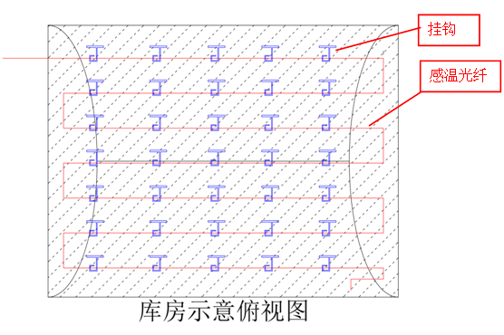 光纜如圖敷設(shè),每隔2米設(shè)一排掛鉤,每排掛鉤基本平型(高度空能不同),掛鉤上所敷設(shè)的光纜監(jiān)測(cè)其下方半徑為1米的空間。光纜長(zhǎng)度可定制,光纜中間無需熔接。光纜的一端通過光纜接續(xù)盒與FC/APC尾纖熔接,與DTS8000光纖測(cè)溫主機(jī)連接,實(shí)現(xiàn)整個(gè)探測(cè)回路的連接。