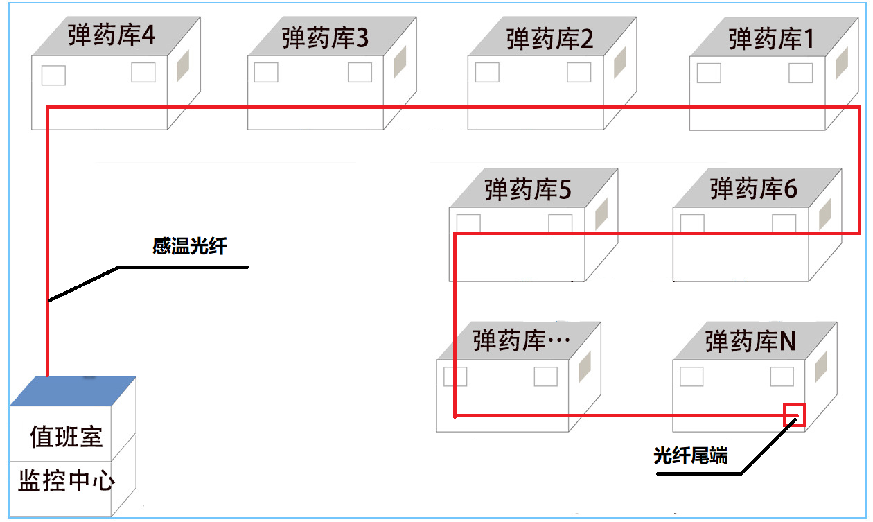 本項(xiàng)目由光纖自動(dòng)火災(zāi)報(bào)警系統(tǒng)對(duì)一系列彈藥儲(chǔ)存庫(kù)進(jìn)行進(jìn)行溫度監(jiān)控。