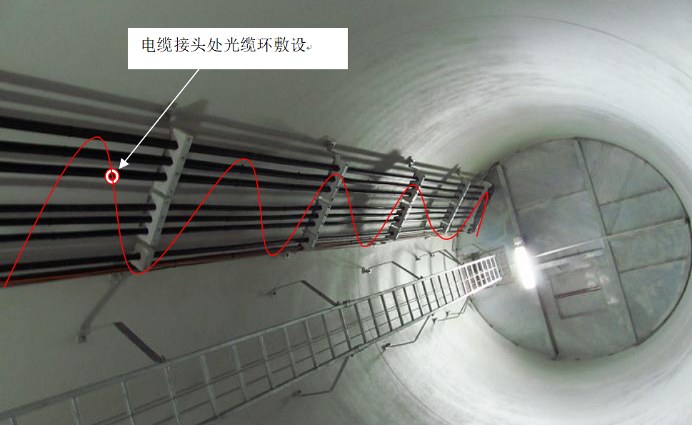 感溫光纜以正弦方式敷設(shè)于電纜表面,用尼龍扎帶綁扎固定;電纜中間接頭處將光纜做環(huán)形敷設(shè),重點監(jiān)測接頭溫度。