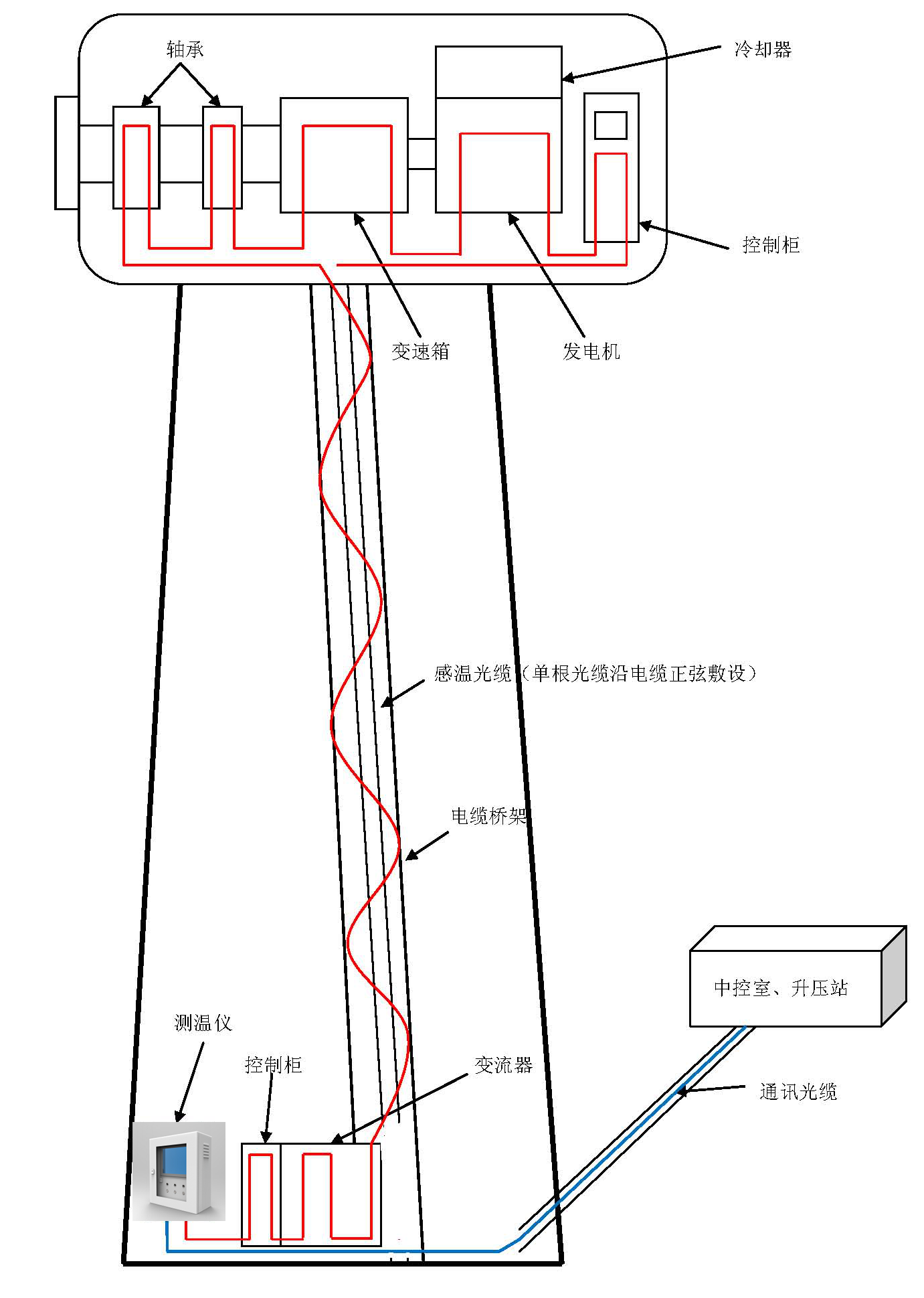 每臺風(fēng)力發(fā)電機組中安裝一臺分布式光纖測溫主機,安裝于塔筒一層,連接鎧裝感溫光纜,光纜敷設(shè)于各設(shè)備表面,實時監(jiān)測溫度信息。被監(jiān)測設(shè)備(以現(xiàn)場施工條件允許為準(zhǔn))包括:塔筒底層電纜室,塔一層控制柜、變流器柜,電纜橋架,機艙層剎車系統(tǒng)、軸承、變速箱、發(fā)電機、冷卻器、散熱器、機艙控制柜、電纜夾層等。