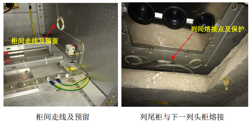 (2)開關(guān)柜與柜之間采用柜內(nèi)線槽走線或預(yù)留穿線孔穿線,柜間預(yù)留段光纖與相間類似。如下左圖: