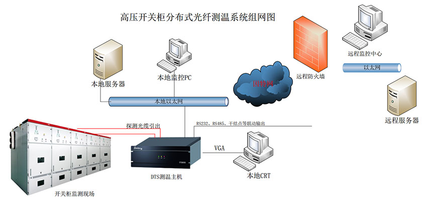 在電力系統(tǒng)尤其是高壓和超高壓系統(tǒng)中使用的設(shè)備,首先要滿足絕緣耐壓的要求,即不能降低原有設(shè)備的電壓等級(jí)和安全特性,基于光在光纖中的拉曼散射特性原理的分布式測(cè)溫系統(tǒng)在監(jiān)測(cè)現(xiàn)場(chǎng)為全光測(cè)量,并且采用二次套塑料(PVC/PVDF/LSZH/Hytrel)等材料披覆的特殊光纜完全滿足高壓開關(guān)柜內(nèi)的絕緣耐壓要求。